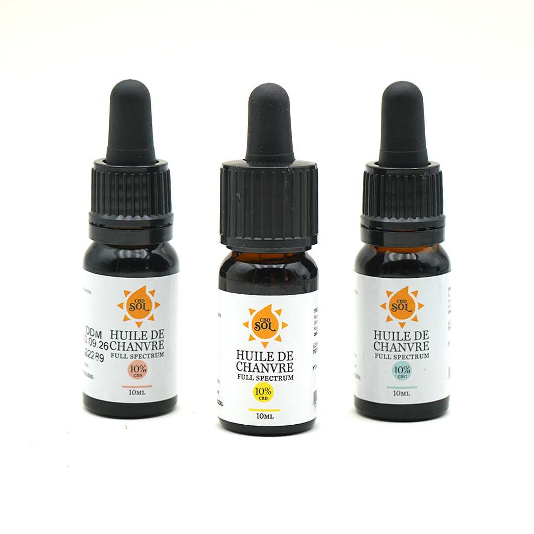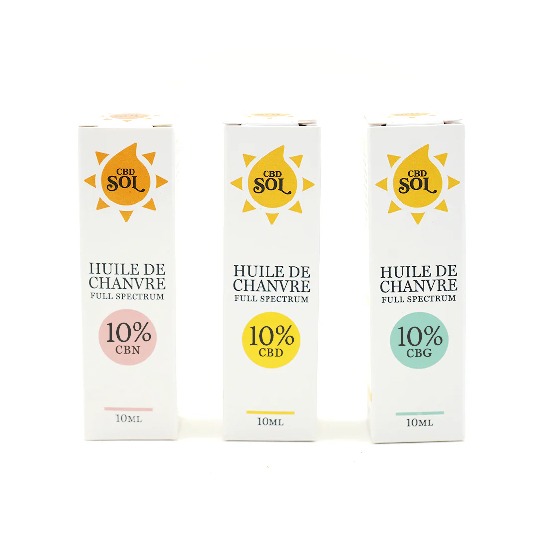 Les cannabinoïdes présentent bien souvent des propriétés différentes. Si vous n'avez pas encore fait votre choix entre le CBD, le CBG et le CBN ; nous vous proposons un pack de trois huiles pour découvrir ces trois molécules. Ce coffret contient 1 flacon de 10 ml. d'extraits de Cannabidiol (10%), 1 flacon de 10 ml. d'extraits de Cannabigérol (10%), et 1 flacon de 10 ml. d'extraits de Cannabinol (10%). Vous avez ainsi l'opportunité de découvrir ces cannabinoïdes, les tester, et ainsi trouver celui qui correspond à vos besoins.